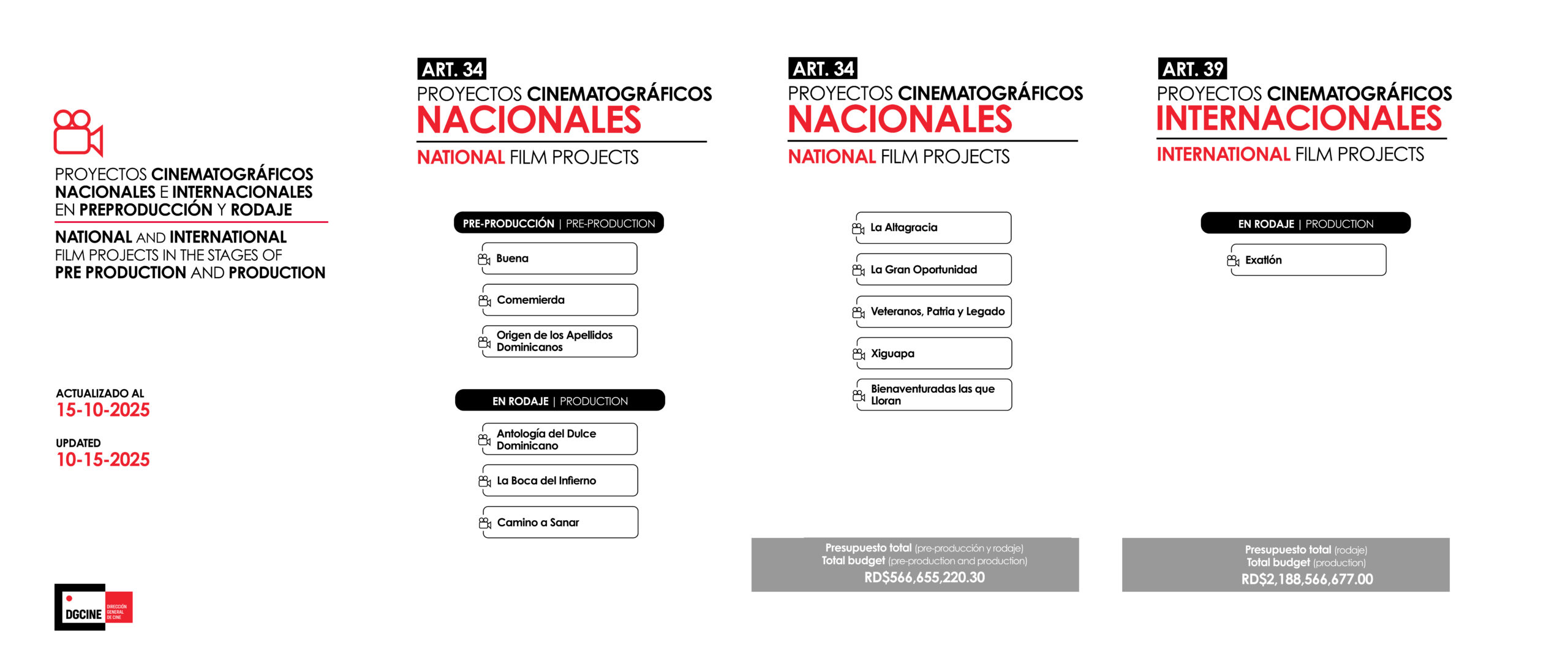 Servicios Ver Todo SISTEMA DE INFORMACIÓN Y REGISTRO CINEMATOGRÁFICO (SIRECINE) DEPARTAMENTO LEGAL FONPROCINE DIVISIÓN DE CAPACITACIÓN Y FORMACIÓN ConvocatoriasInternacionales Dependencias Ver Todo CINEMATECA DOMINICANA Herramientas AcuerdosCoproducción ESTADíSTICAS Catálogo en venta Noticias Ver Todo El Festival Internacional de Cortometrajes Minuto del Agua celebra su décimo aniversario con una gala de reconocimientos 16 de octubre de 2025 Con gran éxito queda inaugurada la tercera edición de Lente Quisqueya 14 de octubre de 2025 DGCINE anuncia la apertura de la convocatoria para el Visitors Programme del Berlinale Co-Production Market 2026 14 de octubre de 2025 DGCINE impulsa la cooperación internacional en el Festival de San Sebastián 2025 8 de octubre de 2025 Proyectos dominicanos son reconocidos en el Trinidad and Tobago Film Festival 2025 8 de octubre de 2025 DGCINE anuncia las candidaturas admitidas a la decimocuarta edición del Concurso Público FONPROCINE 7 de octubre de 2025 DGCINE fortalece lazos institucionales en España durante Iberseries & Platino Industria 2025 2 de octubre de 2025 Se estrena la película dominicana de suspenso y terror Baño de Mujeres 2 de octubre de 2025 Proyecto Marianne por la Cultura impulsa Taller de Video Mapping en República Dominicana 1 de octubre de 2025 El documental Nieta de mi abuela gana premio en el New York Latino Film Festival 1 de octubre de 2025 ¿Estás buscando profesionales para tu proyecto de filmación? En este portal contamos con una amplia lista de profesionales para tus proyectos de filmación. Ver directorio Publicaciones y Estadísticas Producciones en curso 0 Total de Crews 0 Estudios 0 Más Información Suscríbete a nuestra base de datos Correo electrónico Nombre y apellidos Sí, me gustaría recibir correos electrónicos de la Comisión de Cine de República Dominicana (DGCINE). (Puedes darte de baja en cualquier momento) Suscribete ahora Producciones en curso Enlaces Gubernamentales